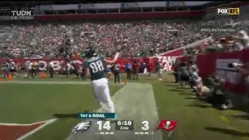 El TE de Philadelphia recibe pase de Jalen Hurts en zona de gol para anotar ante Buccaneers.