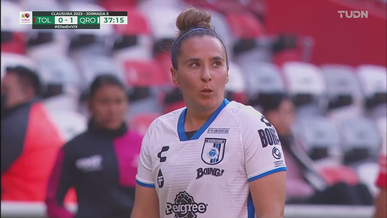 Mirelle puso un buen remate buscando a sus compañeras para rematar a gol, pero las escarlatas estuvieron atentas.