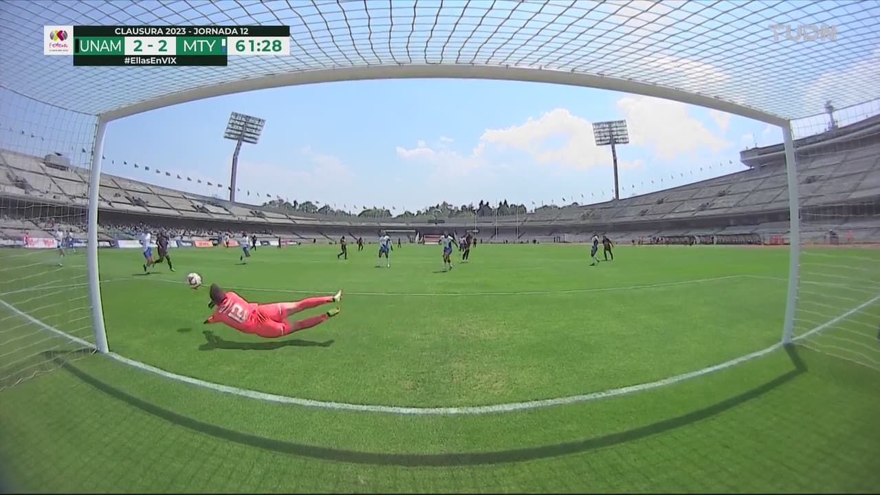 La delantera de Pumas la prende en el área y la portera de Monterrey reacciona de manera perfecta.