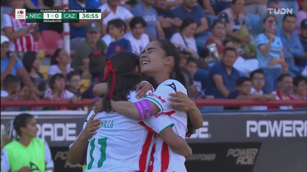 Gran remate de cabeza por parte de Samantha que nada puede hacer González para hacer explotar el Estadio Victoria a los 37'.