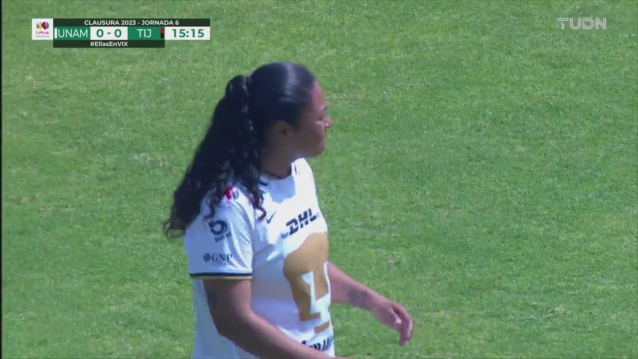 La atacante de Pumas se anima de fuera del área y la pelota termina por un costado, al minuto 15.
