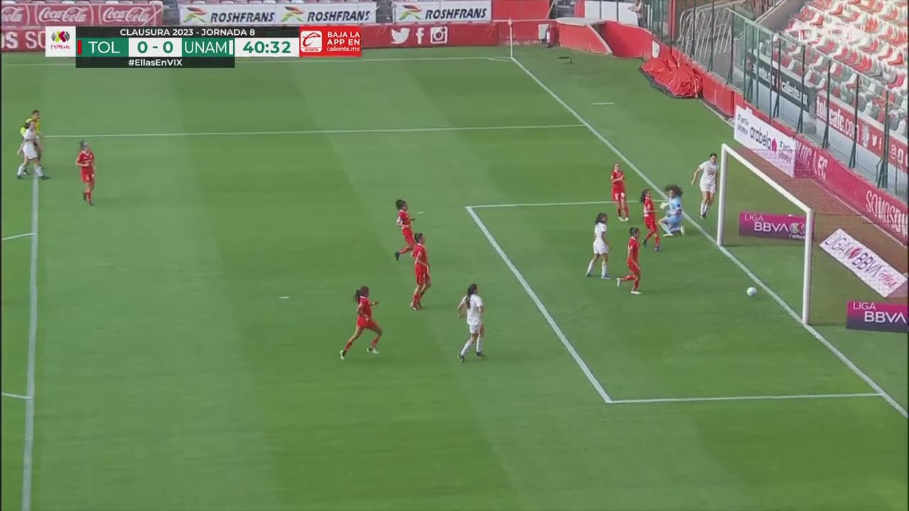 Stephanie condujo intentando un gol olímpico, pero la pierna de la cancerbera escarlata no lo permitió al 41'.