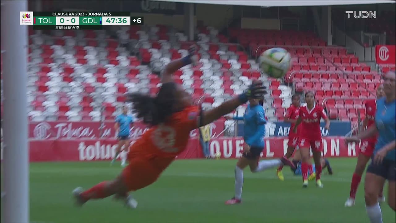 Joseline hace el recorte para encontrar el espacio y dispara, pero la guardameta logra rechazar.