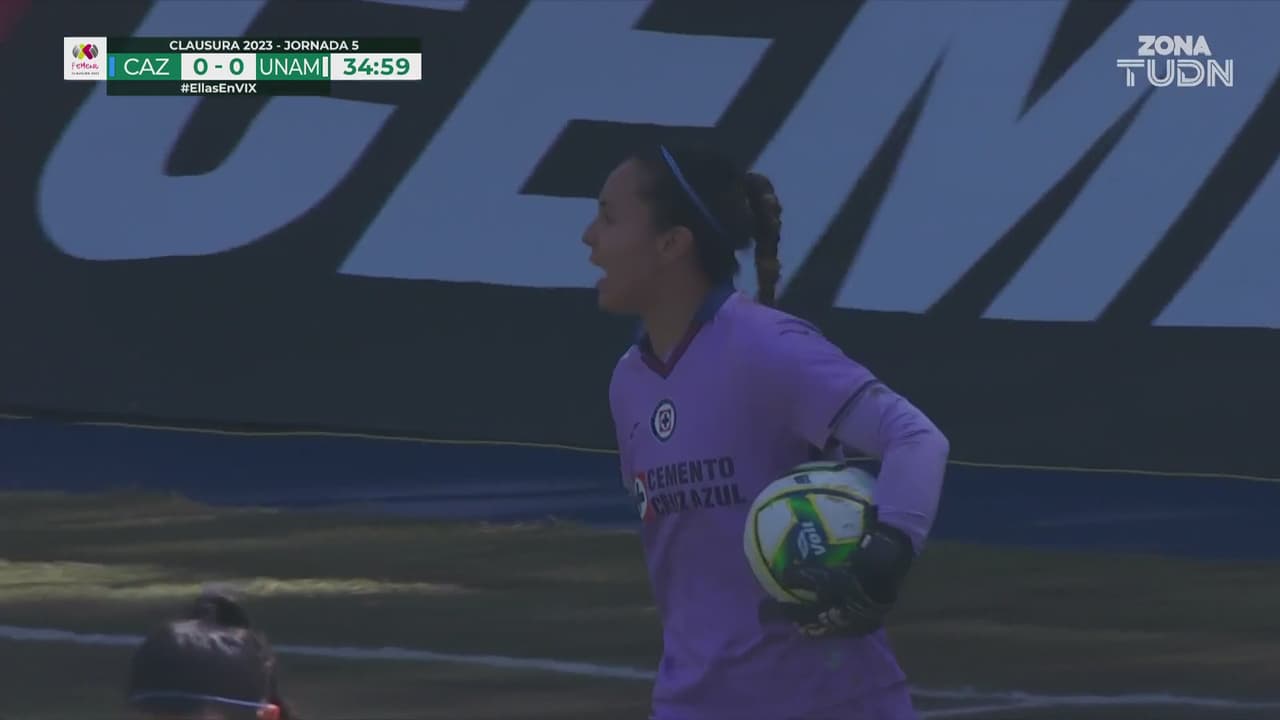 La atacante de Pumas hace el movimiento al centro y dispara, pero Machuca está bien colocada.