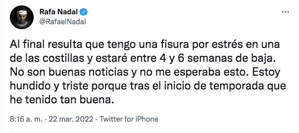 “Hola todos, quería anunciaros que he vuelto a España y fui enseguida a visitar a mi equipo médico para hacerme las pruebas tras la final de Indian Wells que jugué con molestias.", declaró Nadal en su cuenta personal de Twitter este martes.