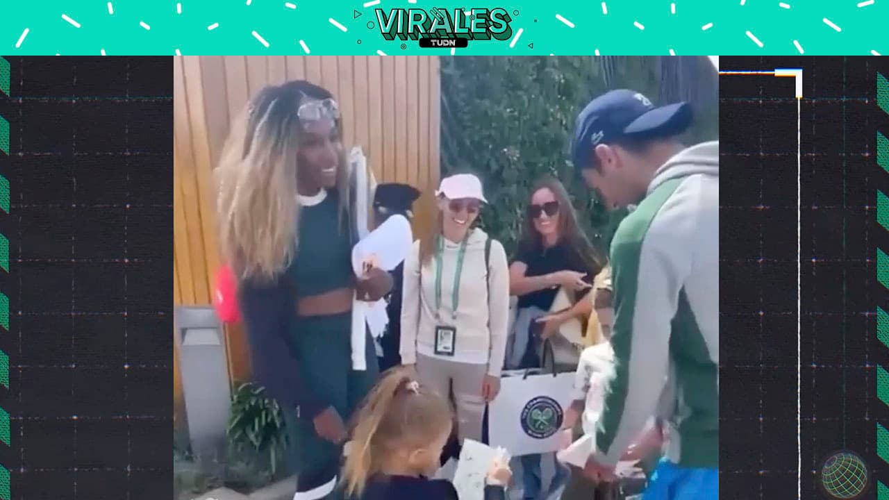 La legendaria tenista estadounidense firmó autógrafos a los pequeños del serbio, quien defiende su título en Wimbledon.