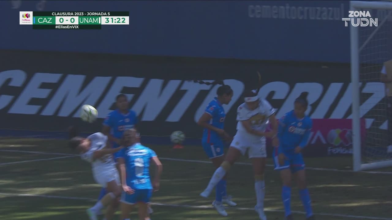 La defensa de Pumas está en el área, pero se topa con el tiro de esquina y no pude conectarla bien.