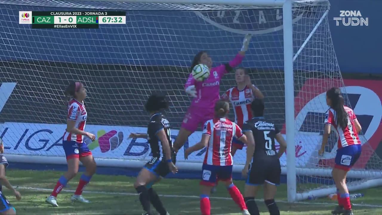 La portera de San Luis sale a cortar el centro y nadie de Cruz Azul consigue rematar, al minuto 67.